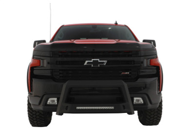 Whether the truck has aggressive lines or more refined curves, the LUND Revolution Bull Bar delivers extra front-end protection with its leading edge, chiseled three-dimensional design. LUND Revolution is constructed from heavy-gauge stamped steel with a light textured matte-black, powder coated finish. The rugged style features an integrated off-road LED light bar with a wiring kit, and installs with no drilling.