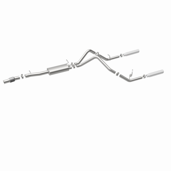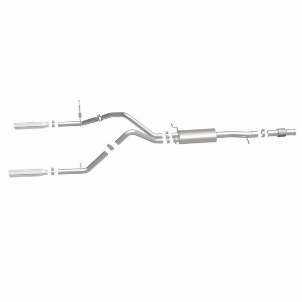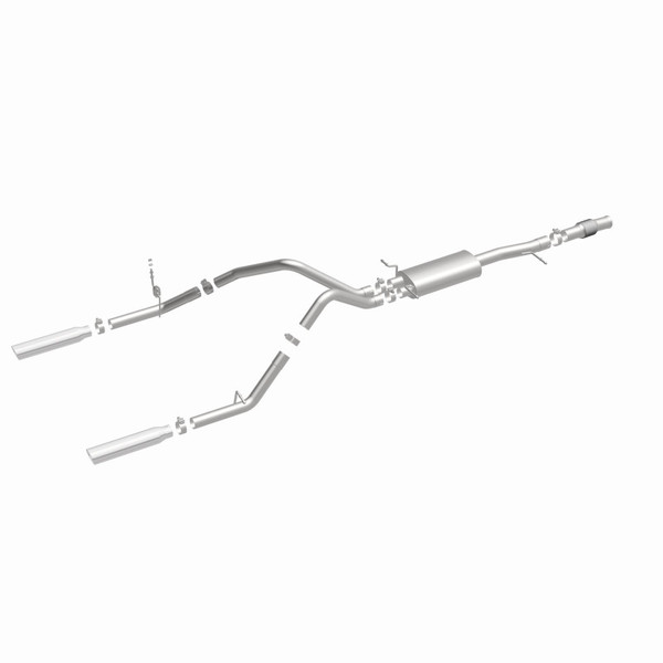 The MagnaFlow Street Series Cat-Back Performance Exhaust System 15278 brings out the personality of your Truck with our signature resonant, powerful engine tone and dyno-proven performance. Thanks to its fast-flowing, mandrel bent 3in. main piping and 1 Straight-Through mufflers ending in a Dual Split Rear exit with 3.5in. Polished Clamp-On Single Wall Angle Cut Rolled Edge tips, this Truck exhaust kit has the performance chops to match its sporty sound and appearance. Upgrade your ride to the next level with an exhaust that has the pipes to put other Truck's to shame. With this system your vehicle will be producing Aggressive exterior and Moderate interior sound levels while leaving other cars and trucks feeling envious at every stoplight. Exhaust kit 15278 features a cat-back layout that replaces your ride's stock exhaust components from near the catalytic converter on back. Extensive 3D scanning during development has resulted in a direct-fit design that you can easily install yourself. 15278 is produced using CNC precision robotic manufacturing techniques and is backed by MagnaFlow's 1-year limited finish warranty and limited lifetime construction warranty.