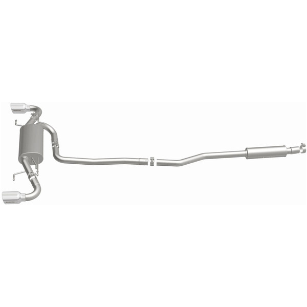 The MagnaFlow 2014-2018 Mazda 3 Street Series Cat-Back Performance Exhaust System 15297 brings out the personality of your 2.0L, 2.5L 2014-2018 Mazda 3 with our signature resonant, powerful engine tone and dyno-proven performance. Thanks to its fast-flowing, mandrel bent 2.25in. main piping and 2 Straight-Through mufflers ending in a Dual Split Rear exit with 4in. Polished Welded-On Double Wall Angle Cut Rolled Edge tips, this Mazda 3 exhaust kit has the performance chops to match its sporty sound and appearance. Upgrade your ride to the next level with an exhaust that has the pipes to put other Mazda 3's to shame. With this system your vehicle will be producing Moderate exterior and Mild interior sound levels while leaving other cars and trucks feeling envious at every stoplight. Exhaust kit 15297 features a cat-back layout that replaces your ride's stock exhaust components from near the catalytic converter on back. Extensive 3D scanning during development has resulted in a direct-fit design that you can easily install yourself. 15297 is produced using CNC precision robotic manufacturing techniques and is backed by MagnaFlow's 1-year limited finish warranty and limited lifetime construction warranty.