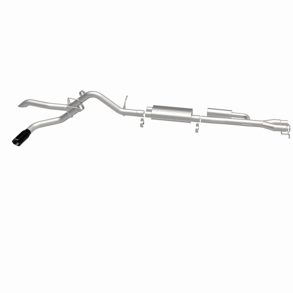 The MagnaFlow Ford Ranger Overland Series Cat-Back Performance Exhaust System #19663 is engineered for off-road function and built to explore further. This exhaust system is designed for the 2024-2025 Ford Ranger equipped with the V6 2.7L engine option. The high clearance exhaust design of this kit is intended to keep your truck clear of any challenging terrain or obstacles you may come across. #19663 3” diameter mandrel bent main piping passes through a No Drone Technology (NDT) chamber and an all-new specifically tuned performance oval muffler before exiting in a high-clearance single passenger side rear exit style. Also included is a clamp-on tailpipe sub-assembly with a single passenger side rear exit and black chrome 4” tip giving you a finished look when cruising around town. MagnaFlow NDT utilizes passive quarter-wave noise cancellation to minimize the unwanted droning noises that can otherwise occur at highway cruising speeds. Exhaust kit #19663 utilizes a direct-fit, easy to install design that replaces your OEM exhaust system from the catalytic converter on back. This Ford Ranger cat-back performance exhaust system is made of durable, corrosion resistant stainless steel and produced using advanced CNC precision robotic manufacturing techniques, all backed by MagnaFlow’s limited lifetime warranty.