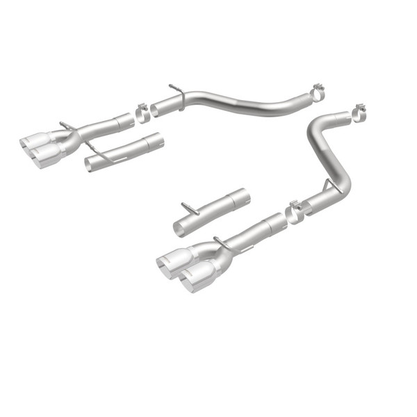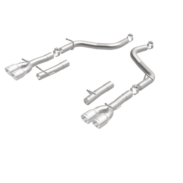 The MagnaFlow 2015-2023 Dodge Challenger Race Series Axle-Back Performance Exhaust System 19218 doesn't leave any performance on the table with a race-ready, light weight, dyno-proven design ready to help your 3.6L 2015-2023 Dodge Challenger take on any pretenders, whether on the track or the street. Exhaust kit 19218 is engineered to produce our powerful, resonant signature exhaust note at Very Aggressive exterior and Aggressive interior sound levels with an axle-back layout that replaces your vehicle's exhaust components from near the rear axle on back. Please check to ensure compliance with local noise regulations. This Dodge Challenger exhaust kit features fast-flowing mandrel bent 2.5in. diameter main piping that ends in a Quad Split Rear exit with 3.5in. Polished Welded-On Double Wall Angle Cut Folded Edge tips. Extensive 3D scanning during development and the use of advanced CNC precision robotic manufacturing techniques ensures that 19218's direct-fit design fits so perfectly that you can easily install the system yourself. The durable, corrosion resistant stainless steel construction of exhaust system 19218 is backed by MagnaFlow's limited lifetime warranty.