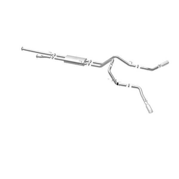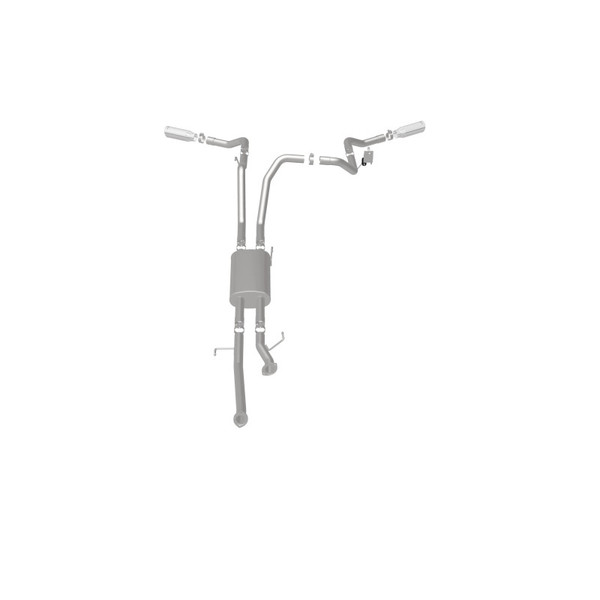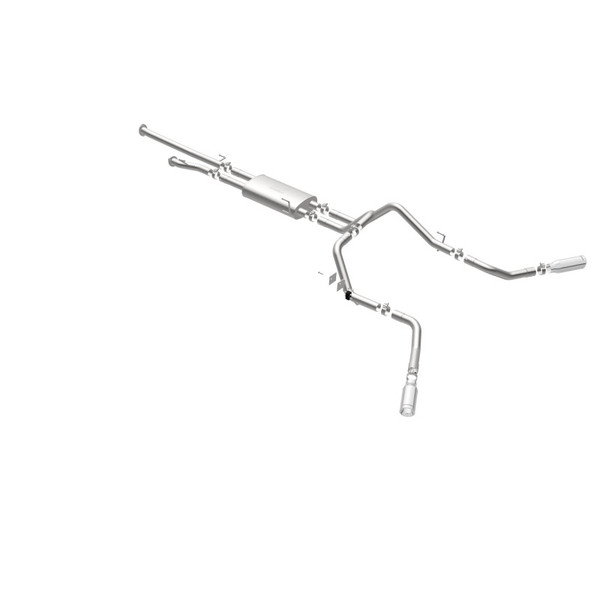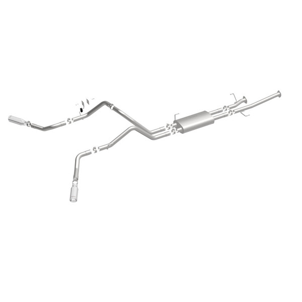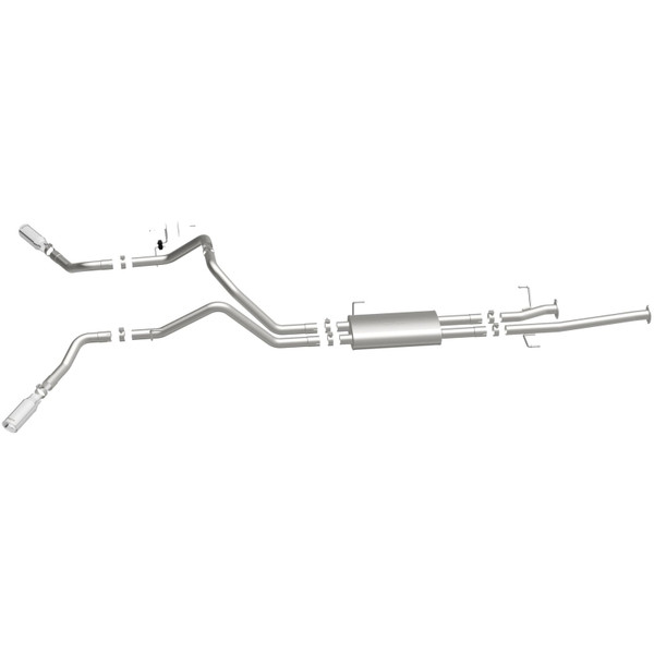 The MagnaFlow 2009-2021 Toyota Tundra Street Series Cat-Back Performance Exhaust System 19232 brings out the personality of your 4.6L, 4.7L, 5.7L 2009-2021 Toyota Tundra with our signature resonant, powerful engine tone and dyno-proven performance. Thanks to its fast-flowing, mandrel bent 2.5in. main piping and 1 Straight-Through mufflers ending in a Dual Split Rear Behind Rear Tires exit with 4in. Polished Clamp-On Double Wall Angle Cut Rolled Edge tips, this Toyota Tundra exhaust kit has the performance chops to match its sporty sound and appearance. Upgrade your ride to the next level with an exhaust that has the pipes to put other Toyota Tundra's to shame. With this system your vehicle will be producing Aggressive exterior and Moderate interior sound levels while leaving other cars and trucks feeling envious at every stoplight. Exhaust kit 19232 features a cat-back layout that replaces your ride's stock exhaust components from near the catalytic converter on back. Extensive 3D scanning during development has resulted in a direct-fit design that you can easily install yourself. 19232 is produced using CNC precision robotic manufacturing techniques and is backed by MagnaFlow's 1-year limited finish warranty and limited lifetime construction warranty.