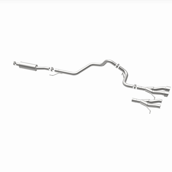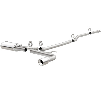 The MagnaFlow 2013-2017 Hyundai Veloster Street Series Cat-Back Performance Exhaust System 19325 brings out the personality of your 1.6L 2013-2017 Hyundai Veloster with our signature resonant, powerful engine tone and dyno-proven performance. Thanks to its fast-flowing, mandrel bent 2.5in. main piping and 1 Straight-Through mufflers ending in a Dual Center Rear exit with 4in. Polished Welded-On Double Wall Angle Cut Folded Edge tips, this Hyundai Veloster exhaust kit has the performance chops to match its sporty sound and appearance. Upgrade your ride to the next level with an exhaust that has the pipes to put other Hyundai Veloster's to shame. With this system your vehicle will be producing Moderate exterior and Mild interior sound levels while leaving other cars and trucks feeling envious at every stoplight. Exhaust kit 19325 features a cat-back layout that replaces your ride's stock exhaust components from near the catalytic converter on back. Extensive 3D scanning during development has resulted in a direct-fit design that you can easily install yourself. 19325 is produced using CNC precision robotic manufacturing techniques and is backed by MagnaFlow's 1-year limited finish warranty and limited lifetime construction warranty.