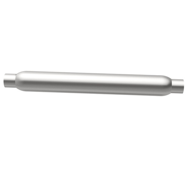 The MagnaFlow 3.5in. Round Glasspack Performance Exhaust Muffler 18145 enhances your ride with the deep, classic sound that glasspack mufflers are known for. The round muffler body features a free-flowing reversible straight-through 2.25/2.25in. diameter configuration and single stage packing with a satin finish. This weight-optimized glasspack muffler is engineered to bring out the inner hot rod in your ride with plenty of volume and dyno-proven performance, so please check to ensure compliance with local noise regulations. 18145 offers flexibility when it comes to installation thanks to its universal design, however, professional installation is recommended. Muffler 18145 is made of corrosion resistant aluminized steel and produced using CNC precision robotic manufacturing techniques, all backed by MagnaFlow's 90-day limited construction warranty.