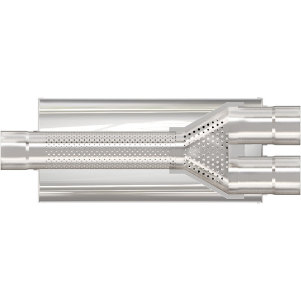 The MagnaFlow 7in. Round Straight-Through Performance Exhaust Muffler 12763 brings our world-famous exhaust sound and dyno-proven performance to your ride in a weight-optimized 7x7x24in. package with a premium satin finish. The straight-through free-flowing design of this round-bodied muffler's reversible, universal 3/2.5in. diameter inlet/outlet layout enables versatile installation options to match the spacing requirements of your vehicle. Due to the cutting and welding involved, professional installation is highly recommended. Internally, 12763 utilizes a perforated stainless steel core wrapped in stainless steel mesh and acoustic fiber fill to achieve a powerful, resonant tone. This muffler is made of durable, corrosion resistant stainless steel and produced using cutting-edge CNC precision robotic manufacturing techniques, all backed by MagnaFlow's limited lifetime construction warranty.