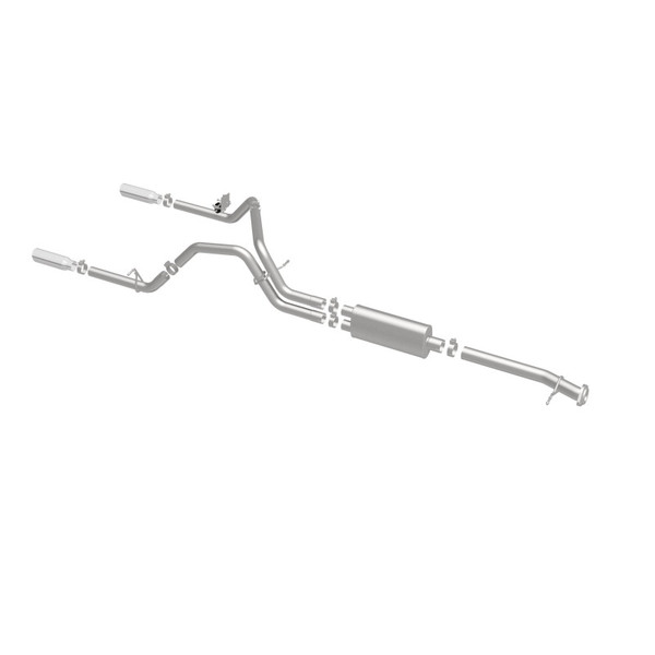 The MagnaFlow Street Series Cat-Back Performance Exhaust System 19019 brings out the personality of your Truck with our signature resonant, powerful engine tone and dyno-proven performance. Thanks to its fast-flowing, mandrel bent 3in. main piping and 1 Straight-Through mufflers ending in a Dual Split Rear exit with 3.5in. Polished Clamp-On Double Wall Angle Cut Rolled Edge tips, this Truck exhaust kit has the performance chops to match its sporty sound and appearance. Upgrade your ride to the next level with an exhaust that has the pipes to put other Truck's to shame. With this system your vehicle will be producing Aggressive exterior and Moderate interior sound levels while leaving other cars and trucks feeling envious at every stoplight. Exhaust kit 19019 features a cat-back layout that replaces your ride's stock exhaust components from near the catalytic converter on back. Extensive 3D scanning during development has resulted in a direct-fit design that you can easily install yourself. 19019 is produced using CNC precision robotic manufacturing techniques and is backed by MagnaFlow's 1-year limited finish warranty and limited lifetime construction warranty.