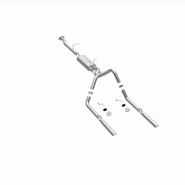 The MagnaFlow Street Series Cat-Back Performance Exhaust System 15796 brings out the personality of your Truck with our signature resonant, powerful engine tone and dyno-proven performance. Thanks to its fast-flowing, mandrel bent 2.5in. main piping and 1 Straight-Through mufflers ending in a Dual Split Rear exit with 3in. Polished Clamp-On Single Wall Angle Cut Cut Edge tips, this Truck exhaust kit has the performance chops to match its sporty sound and appearance. Upgrade your ride to the next level with an exhaust that has the pipes to put other Truck's to shame. With this system your vehicle will be producing Aggressive exterior and Moderate interior sound levels while leaving other cars and trucks feeling envious at every stoplight. Exhaust kit 15796 features a cat-back layout that replaces your ride's stock exhaust components from near the catalytic converter on back. Extensive 3D scanning during development has resulted in a direct-fit design that you can easily install yourself. 15796 is produced using CNC precision robotic manufacturing techniques and is backed by MagnaFlow's 1-year limited finish warranty and limited lifetime construction warranty.