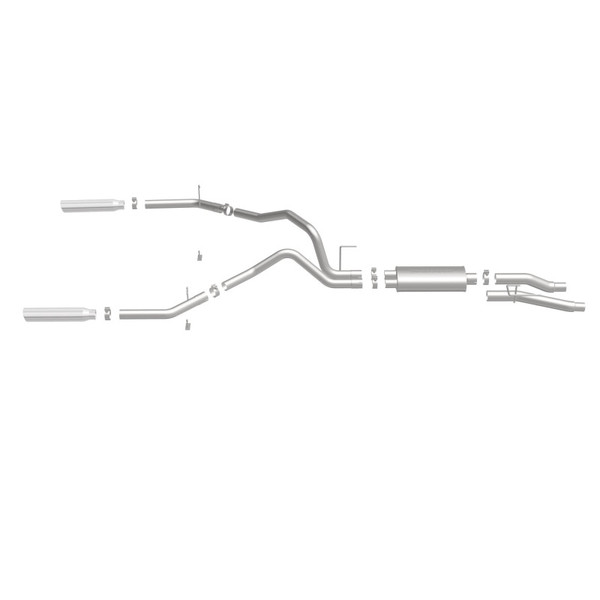 The MagnaFlow Street Series Cat-Back Performance Exhaust System 16520 brings out the personality of your Truck with our signature resonant, powerful engine tone and dyno-proven performance. Thanks to its fast-flowing, mandrel bent 3in. main piping and 1 Straight-Through mufflers ending in a Dual Split Rear exit with 3.5in. Polished Clamp-On Single Wall Angle Cut Rolled Edge tips, this Truck exhaust kit has the performance chops to match its sporty sound and appearance. Upgrade your ride to the next level with an exhaust that has the pipes to put other Truck's to shame. With this system your vehicle will be producing Aggressive exterior and Moderate interior sound levels while leaving other cars and trucks feeling envious at every stoplight. Exhaust kit 16520 features a cat-back layout that replaces your ride's stock exhaust components from near the catalytic converter on back. Extensive 3D scanning during development has resulted in a direct-fit design that you can easily install yourself. 16520 is produced using CNC precision robotic manufacturing techniques and is backed by MagnaFlow's 1-year limited finish warranty and limited lifetime construction warranty.