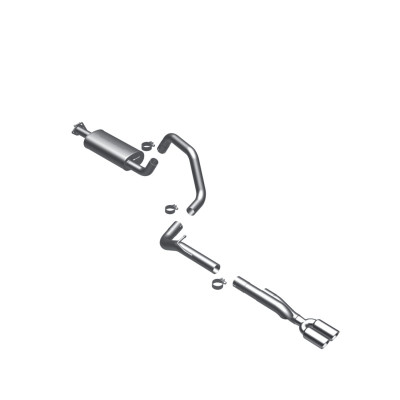 The MagnaFlow 1986-2004 Ford Mustang Competition Series Cat-Back Performance Exhaust System 17118 brings an aggressive, attention-grabbing edge to the deep resonant exhaust note we're so well known for. This exhaust kit is designed to enhance your 4.6L, 5.0L, 5.8L 1986-2004 Ford Mustang with dyno-proven performance made possible thanks to fast-flowing mandrel bent 2.5in. main piping and 2 Straight-Through mufflers ending in a Turndown In Front Of Rear Tire exit with 2.75in. Polished Clamp-On Single Wall Turndown Cut Edge tips featuring a sporty finish. The exhaust system's cat-back layout replaces your ride's exhaust system from near the catalytic converter on back. Exhaust system 17118 is engineered to make your vehicle's engine produce Aggressive exterior and Moderate interior sound levels, befitting its competition-oriented design. 17118's direct-fit design makes installation a breeze thanks to the use of advanced 3D scanning techniques. This performance exhaust system is made of 100% durable and corrosion-resistant stainless steel and produced using CNC precision robotic manufacturing, all backed by MagnaFlow's limited lifetime warranty. Please check to ensure compliance with local noise regulations.