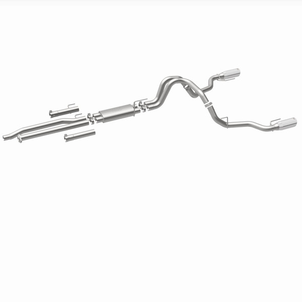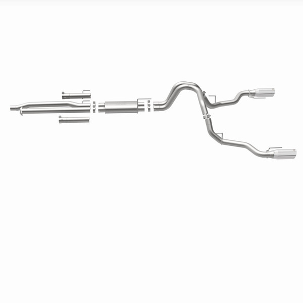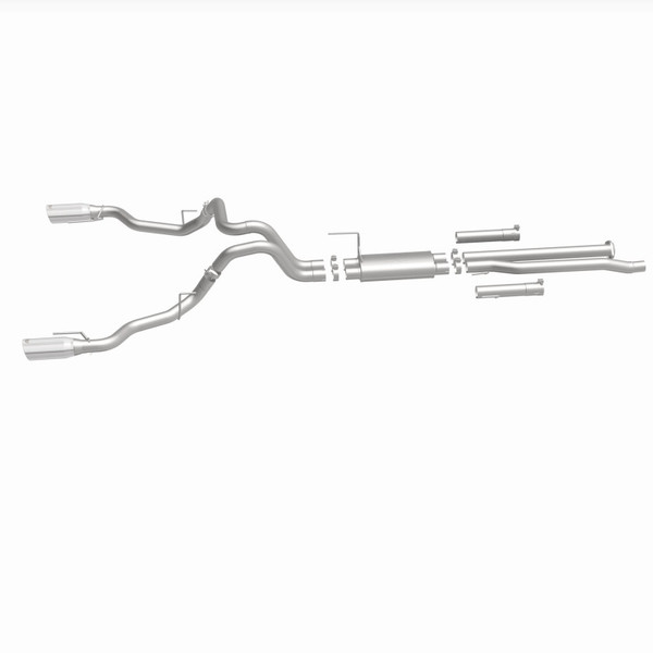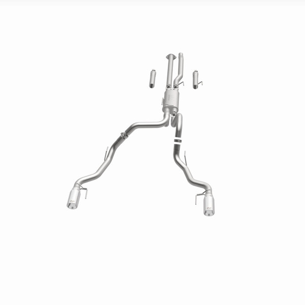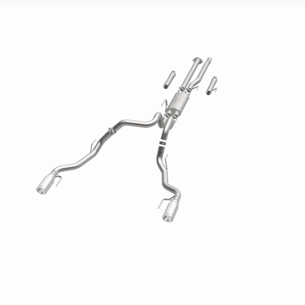The MagnaFlow 2017-2020 Ford F-150 Street Series Cat-Back Performance Exhaust System 19346 brings out the personality of your 3.5L 2017-2020 Ford F-150 with our signature resonant, powerful engine tone and dyno-proven performance. Thanks to its fast-flowing, mandrel bent 3in. main piping and 1 Straight-Through mufflers ending in a Dual Split Rear exit with 5in. Polished Welded-On Double Wall Angle Cut Rolled Edge tips, this Ford F-150 exhaust kit has the performance chops to match its sporty sound and appearance. Upgrade your ride to the next level with an exhaust that has the pipes to put other Ford F-150's to shame. With this system your vehicle will be producing Aggressive exterior and Moderate interior sound levels while leaving other cars and trucks feeling envious at every stoplight. Exhaust kit 19346 features a cat-back layout that replaces your ride's stock exhaust components from near the catalytic converter on back. Extensive 3D scanning during development has resulted in a direct-fit design that you can easily install yourself. 19346 is produced using CNC precision robotic manufacturing techniques and is backed by MagnaFlow's 1-year limited finish warranty and limited lifetime construction warranty.