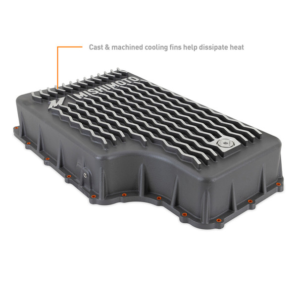 This Mishimoto Aluminum Transmission Pan is a direct-fit, high-performance upgrade for your 2011-2019 Ford 6.7L Powerstroke. Cast from high-quality aluminum and powder coated Gunmetal Gray, our transmission pan is a robust and long-lasting upgrade for your vehicle's transmission. With a sleek design and bottom ribs, this pan not only adds to the overall aesthetic of your truck but also provides improved cooling performance.----This transmission pan features internal baffles that reduce sloshing and enhance heat dissipation, resulting in smoother transmission performance. All the headaches that come with a flat gasket and messy sealants are eliminated with our precision-machined dovetail-style groove and O-ring seal. This groove positively retains the O-ring, so you never have to worry about it falling out of place during installation. Additionally, the Mishimoto 2011-2019 Ford 6.7L Powerstroke Aluminum Transmission Pan adds an extra 5.9 quarts of ATF to help maintain optimal transmission operation.----Fed up with the frustration of trying to hold up a transmission pan with one hand while threading the fasteners in with the other? Mishimoto has you covered with pre-installed bolt retainers that hold the fasteners in the pan, allowing you to easily thread the bolts without dropping them on the ground, your head, or worse, that pan of nasty transmission fluid you just drained. Additionally, our pan comes equipped with a magnetic drain plug for easy draining and a 1/8-inch NPT port and plug for temperature sensors to make servicing your transmission and monitoring temperatures a breeze.----This direct-fit upgrade offers affordable durability and helps maintain smooth transmission operation, ensuring a long life for your transmission. Like all Mishimoto products, this transmission pan is backed by the Mishimoto Lifetime Warranty.