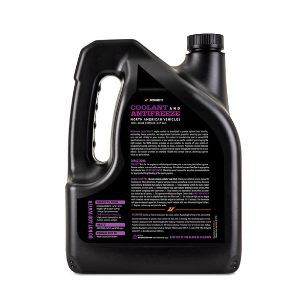 Mishimoto's Liquid Chill Original Equipment engine coolant is formulated with an ethylene glycol base to provide optimalheat transfer, boiling protection up to 265F, freeze protection down to -34F, unparalleled anti-corrosion, and superiorlubrication, ensuring your engine runs cool and reliably for years to come. The pre-diluted 50/50 mixture provides an easysolution for topping off your system or complete flushing and filling. No mixing, no mess, no hassle.----We offer bothuniversal and color-coded formulas that match your vehicle manufacturer' s specifications to make selecting the rightcoolant easy. Our coolant provides an extended 5 year/150,000-mile service interval, delivering superior value andperformance. This one-gallon bottle of purple coolant is specially formulated to be equivalent to Mopar coolant68163848AA and meets ASTM D3306, D6210, and D4985 specifications for your Dodge, Chrysler, Jeep, and Ram.