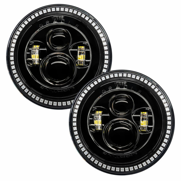 The Ultimate LED replacement headlight option for any vehicle with 7" Sealed Beam lamps. The rugged design is perfect for your Jeep Wrangler, Off-Road Vehicle, Buggies, or Classic Car/ Truck. Installation is very easy with the included H4 and H13 Plug and Play connectors. Each set comes in full color retail-ready packaging and a 2-Year free Replacement Warranty. You can even choose optional colored Halos for even more customization! Improvements in brightness and reliability by adding a constant current LED driver to the main circuit board inside of the lamp to control the halos. NEW! No need for Anti-Flicker Wiring Adapters- The new SMART Integrated Can-Bus system automatically adjusts- preventing flicker issues. Increased Reliability- By conditioning the power going into the LEDs this prevents degradation which can shorten the overall lifespan of the product. Wider Input Voltage Range- The new SMD Halos can operate on a very wide voltage range from 12V-24V so that voltage spike can not damage the LEDs. Brighter LED Halos- by moving the heat load of the resistors off the PCB we are able to increase the number of LEDs on the circuit board without thermal issues. LED chips upgraded from a Cree LED to a Phillips Luxeon ZES chip. They deliver a very high efficacy 130LM/W ratio while having lower thermal output.