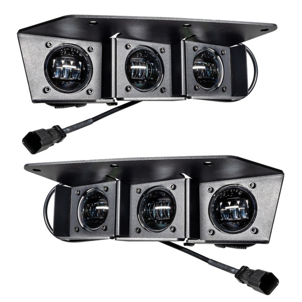 ORACLE Lighting has designed a LED triple fog light kit for the steel factory modular (?mod") bumper on the 2021+ Ford Bronco. Quickly add functional forward-facing LED lighting to your vehicle to illuminate any adventure. The six high-powered emitters provide significant visibility through advanced optics with a 6000 raw Lumen output and a precise no-glare design that avoids blinding other drivers. The powder coat finish, blacked-out appearance, and IP68 waterproof rating offers a sleek look with superior durability to withstand any conditions. The simple bolt-on installation uses factory bolt locations and requires no drilling or modifications for the Bronco fog light kit. Typical installation time is under 30 minutes and can be successfully installed using common hand tools by even the most casual enthusiast. This complete kit includes 2 assembled steel housings, 6 LED Emitters, Wiring Harness, and all necessary hardware. Score first-class LED lighting that illuminates wherever your adventures take you with the ORACLE Lighting Ford Bronco Triple Fog Light Kit!