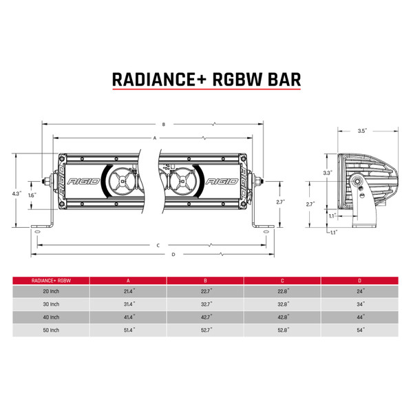 The stylish versatility of the RIGID Radiance light bars just got better. Now introducing Radiance+ RBGW light bars. The latest addition to the Radiance light family provides you with the ability to toggle between eight available backlight options with the flip of a switch: red, green, blue, light blue, purple, amber, white, or demo mode. The RIGID Radiance+ RGBW bars are built with the same high-grade aluminum alloy housing as RIGID's legendary E-Series but include a stylish color-changing backlight. Inside, the Radiance+ RGBW bars are feature-packed, with a black exposed circuit board, optimized forward projecting Spot Drive optics that combine the attributes of a spot and a drive beam pattern. Available in 10, 20, 30, 40, and 50 Inch sizes, the Radiance+ RGBW Lights Bars take the customization of your vehicle to the next level. Own The Night in style with Radiance+ RBGW lighting.