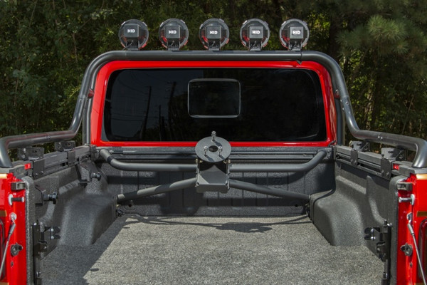 The Rugged Ridge Bed Mount Spare Tire Carrier answers that nagging question on the lips of proud Gladiator owners everywhere, what to do with that over-sized spare? While the factory spare is discretely tucked away under the bed, outfitting your rig with 35 inch or larger tires will have you discovering the Gladiators departure angles to be comparable to an overloaded school bus. Bigger tires do get you over the big rocks, but your low-dangling spare will put an end to your fun in no time at all. Not to mention that lying flat on your back in the muck to access the spare for trail-side tire repair will have you questioning your position on the evolutionary chart. That is why mounting your oversize spare, conveniently and securely, in the truck bed can be a tremendous advantage for off-roaders and overlanders alike. You will find this pre-runner-style Tire Carrier is not just striking in appearance, but engineered to deliver the goods with a hefty load capacity, handily hauling up to a 40-inch wheel and tire combo. Built from muscular 45mm diameter, 2.5mm-wall steel tubing and 5mm thick CNC cut and brake-formed steel plate, this carrier is rock-solid and designed to survive in harsh off-road conditions. The integrated wheel mount is adjustable to accommodate a variety of wheel offsets, while the carrier assembly installs to factory mounting locations for maximum strength and rigidity, with no drilling required. We finished it off with a sleek satin black powder coat to protect from the elements and a limited 5-Year Warranty to protect from everything else, making the Rugged Ridge Bed Mount Tire Carrier a sensible choice for Gladiator owners.