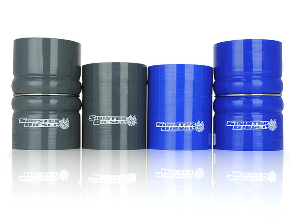 Sinister Diesel Intercooler Charge Pipes for Ford TrucksThe Sinister Diesel Cold Side Charge Pipe Kit for the Powerstroke 6.0L connects the intercooler to the intake. This upgraded pipe is larger in diameter and has smooth mandrel bends to increase air flow velocity to improve power and lower EGTs. The Sinister Diesel Cold Side Charge Pipe Kit is also more durable, being made from 6061 Aluminum alloy and connected with Sinister Diesel's 4-ply silicone boots that are rated up to 400psi. Our Intercooler Pipes are masterfully TIG welded and powdercoated Sinister Blue for a beautiful under-hood look.Features and Benefits:6061 Aluminum Alloy Construction. CNC Mandrel Precision Bent 3" Tubing for a Perfect Fit, 4-Ply Silicone Boots that are rated to 400psi, Stainless Steel Spring Boot Clamps for a Reliable Seal, Powder Coated and Polished in Sinister BlueKit Includes:(1) Cold Side Charge Pipe, (2) Silicone Boots, (4) Stainless Steel Spring Clamps