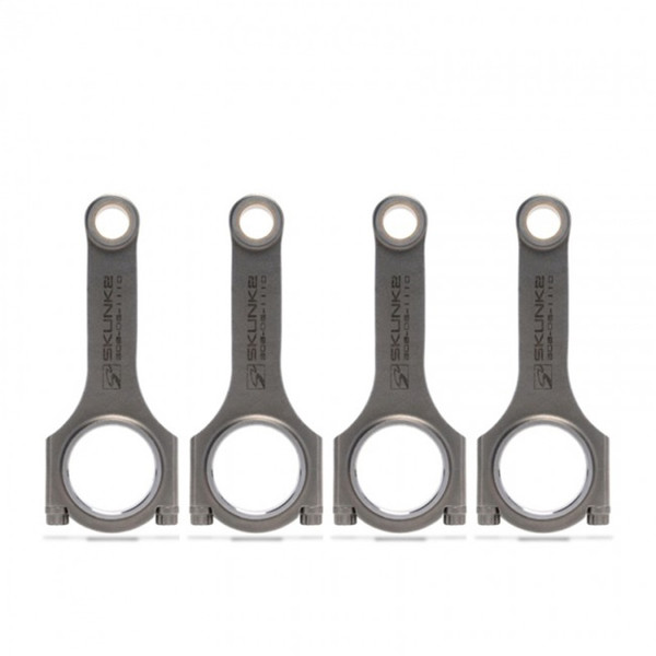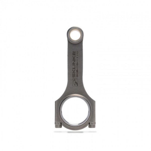 Alpha Series Rods are forged from select 4340 chromoly steel and feature an H-beam design, resulting in the ultimate strength-to-weight ratio. 4340 chromoly is one of the strongest materials available, however, not all 4340 chromoly is the same. As such, Skunk2 relies on extensive material testing and works closely with its foundry to produce high-quality rods at an affordable price. Comprehensive heat-treating, tempering, and shot-peening processes together ensure that each Alpha Series Rod remains consistent and strong. Finally, each rod is magna-fluxed to ensure integrity and that each process has been completed thoroughly and according to Skunk2's rigid specifications. Skunk2's engineers spent nearly three years developing and testing its H-beam rod design. The results are one of the strongest beam configurations available, capable of handling more than 900 hp. Engineers made use of FEA (Finite Element Analysis) to determine high-stress points and implemented features to reduce wear and increase strength. Skunk2's straight design distributes stress across a larger area when compared to tapered rods, providing additional support where necessary. Alpha Series Rods are manufactured from two-piece forgings, resulting in optimal grain orientation along the rod cap for increased strength. By orienting the metal's grain in the direction of stress along the rod cap, perpendicular to the stress exerted along the beam, strength is significantly increased. Skunk2's two-piece forgings provide a precision-tight fit between the rod's cap and its beam without resorting to the brittle materials required by other processes. Alpha Series Rods also feature dual oil passages at their pin ends, providing additional lubrication and cooling, which leads to an even stronger, more durable rod. Unlike other designs, Skunk2's carefully positioned, offset oil passages help deliver lubrication around the entire wrist pin, during each phase of the engine cycle.