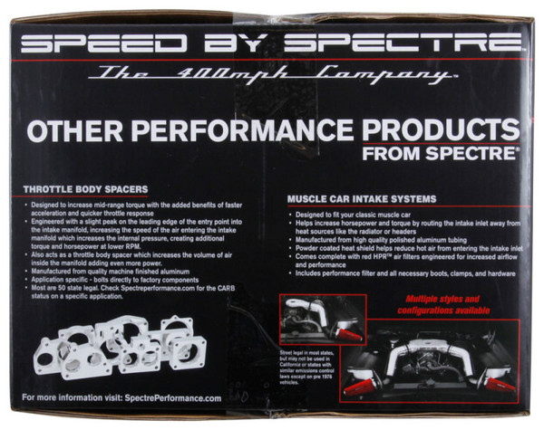 Spectre air intake systems are designed to get more horsepower and torque from your vehicle while working to protect your engine from harmful debris. This air intake system comes with a washable, reusable low restriction Spectre air filter, polished aluminum intake tubing and a black powder coated 2-piece heat shield to help prevent heated engine air from entering the intake inlet. Spectre air intakes come with velocity stack, coupler, stainless steel clamps, edge trim, and all necessary hardware for an OE fit and finish. The air filter mounts on the driver side.
