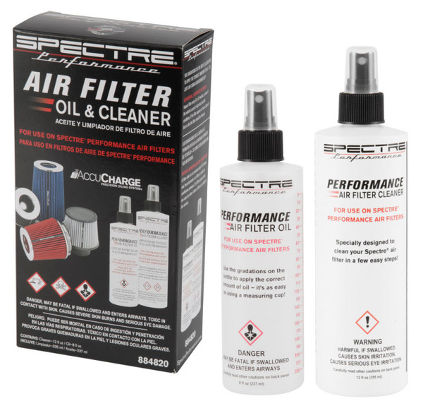 The Spectre Accucharge Precision Air Filter Cleaning and Oiling System was designed for all Spectre HPR replacement and racing air filters. Spectre's AccuCharge precision oiling system features graduation on the bottle for precise measuring and an easy-to-use squirt top bottle making the application both effortless and accurate. The system comes complete with a pump spray bottle of cleaner and one of filter oil, which is made from food grade mineral oil with absolutely no petroleum product or animal fats.