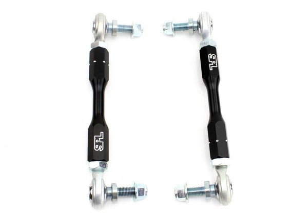 Our SPL PRO rear endlinks (AKA droplinks) for the Infiniti Q50 and Q60 feature massive Teflon lined FK 1/2" bearings to provide the highest load capacity for use with stiffer aftermarket sway bars. Custom heat treated chromoly high misalignment studs connect to the sway bar and offer extreme articulation capability (65deg) to prevent the endlink from binding when used with different adjustment holes on aftermarket sway bars. Our endlinks are length adjustable to eliminate preload on the sway bars, which can result from uneven settling of springs or uneven suspension heights from corner weighting. Black anodized 6061 aluminum turnbuckles work in conjunction with the left and right hand threaded rod ends for simple and precise adjustment. These end links are perfect for street or race applications. Sold as a pair. Made in the USA. Application: 2014+ Infiniti Q50 V37 2017+ Infiniti Q60 CV37 Instructions:SPL RE V37 Instructions