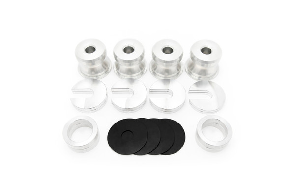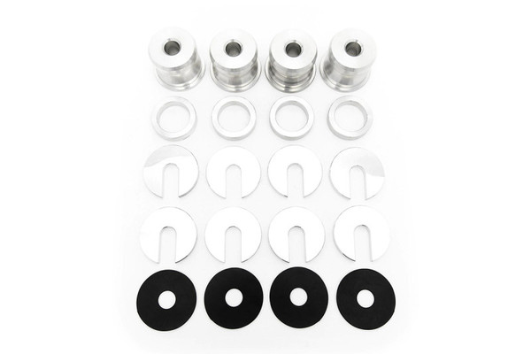SPL Parts PRO Solid Aluminum Subframe Bushings (SSB) replace the stock mushy rubber bushings to eliminate free play of the subframe relative to the chassis. This prevents the subframe from "bouncing around" under drivetrain torque or suspension load, maintaining optimum suspension geometry and reducing wheel hop. Our slide-in shim system allows you to quickly raise or lower the subframe to fine-tune the roll center/anti-squat behavior to your preference. Raising the subframe will compensate roll center for a lowered car at the expense of increasing anti-squat. Lowering the subframe will decrease anti-squat at the expense of roll center. Now Formula Drift Regulation Compliant! With the recent regulation change in Formula D, we changed our kits to comply. You can maintain OEM height and be perfectly legal. SPL PRO series Bushings are precision CNC machined from 6061-T6 Billet Aluminum for an accurate fit. Kit also includes optional rubber isolation washers to reduce noise transfer from the subframe to the chassis. Sold as complete kit for one car.Made in the USA. Applications: 1989-1994 Nissan 240SX (S13) Installation Instructions: SPL Parts Solid Subframe Bushings S13
