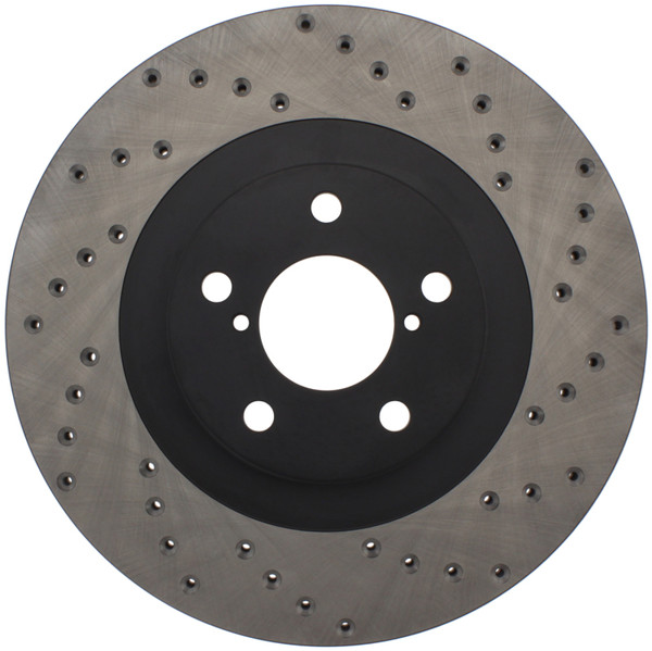 StopTech Drilled Sport Rotors are 1-piece direct replacement brake discs for factory brake systems and stock calipers that look great behind your wheels – and offer significantly improved braking performance. The unique cross-drilling aids with heat and brake dust dispersal; prevents glazing of the pads; adds bite and improves wet and dry braking performance. Built to last; the black e-coating provides protection from corrosion and the high carbon metallurgy (in most applications) offers quieter operation; better crack resistance and increased performance.
