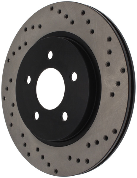 StopTech Drilled Sport Rotors are 1-piece direct replacement brake discs for factory brake systems and stock calipers that look great behind your wheels – and offer significantly improved braking performance. The unique cross-drilling aids with heat and brake dust dispersal, prevents glazing of the pads, adds bite and improves wet and dry braking performance. Built to last, the black e-coating provides protection from corrosion and the high carbon metallurgy (in most applications) offers quieter operation, better crack resistance and increased performance.