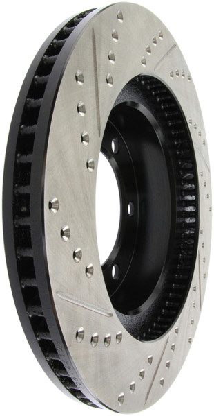 StopTech Drilled and Slotted Sport Rotors are 1-piece direct replacement brake discs for factory brake systems and stock calipers that look great behind your wheels – and offer significantly improved braking performance. The unique cross-drilling and slotting aids with heat and brake dust dispersal; prevents glazing of the pads; adds bite and improves wet and dry braking performance. Built to last; the black e-coating provides protection from corrosion and the high carbon metallurgy (in most applications) offers quieter operation; better crack resistance and increased performance.