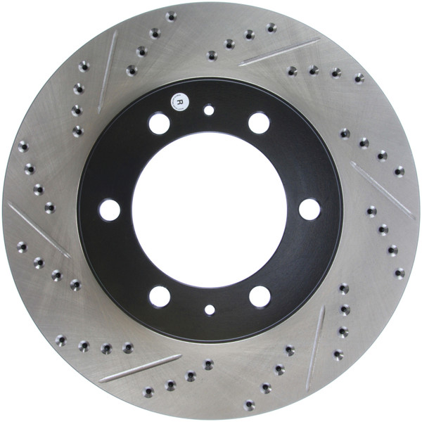 StopTech Drilled and Slotted Sport Rotors are 1-piece direct replacement brake discs for factory brake systems and stock calipers that look great behind your wheels – and offer significantly improved braking performance. The unique cross-drilling and slotting aids with heat and brake dust dispersal; prevents glazing of the pads; adds bite and improves wet and dry braking performance. Built to last; the black e-coating provides protection from corrosion and the high carbon metallurgy (in most applications) offers quieter operation; better crack resistance and increased performance.