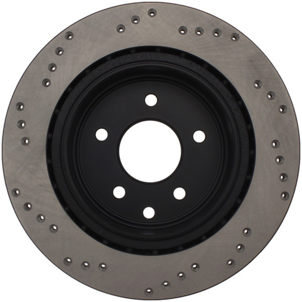 StopTech Drilled Sport Rotors are 1-piece direct replacement brake discs for factory brake systems and stock calipers that look great behind your wheels – and offer significantly improved braking performance. The unique cross-drilling aids with heat and brake dust dispersal; prevents glazing of the pads; adds bite and improves wet and dry braking performance. Built to last; the black e-coating provides protection from corrosion and the high carbon metallurgy (in most applications) offers quieter operation; better crack resistance and increased performance.