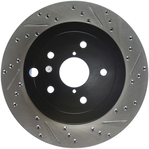 StopTech Drilled and Slotted Sport Rotors are 1-piece direct replacement brake discs for factory brake systems and stock calipers that look great behind your wheels – and offer significantly improved braking performance. The unique cross-drilling and slotting aids with heat and brake dust dispersal; prevents glazing of the pads; adds bite and improves wet and dry braking performance. Built to last; the black e-coating provides protection from corrosion and the high carbon metallurgy (in most applications) offers quieter operation; better crack resistance and increased performance.
