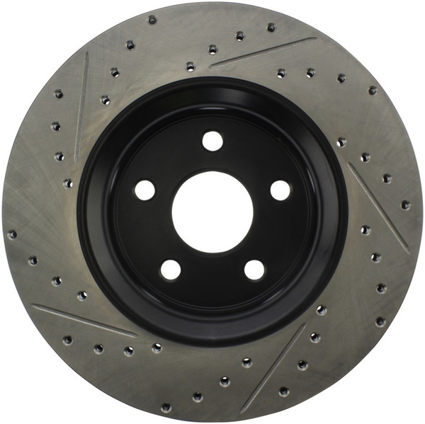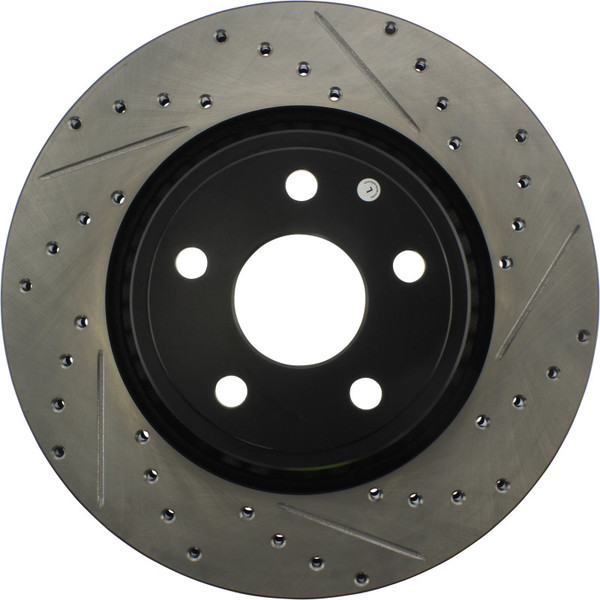 StopTech Drilled and Slotted Sport Rotors are 1-piece direct replacement brake discs for factory brake systems and stock calipers that look great behind your wheels – and offer significantly improved braking performance. The unique cross-drilling and slotting aids with heat and brake dust dispersal; prevents glazing of the pads; adds bite and improves wet and dry braking performance. Built to last; the black e-coating provides protection from corrosion and the high carbon metallurgy (in most applications) offers quieter operation; better crack resistance and increased performance.