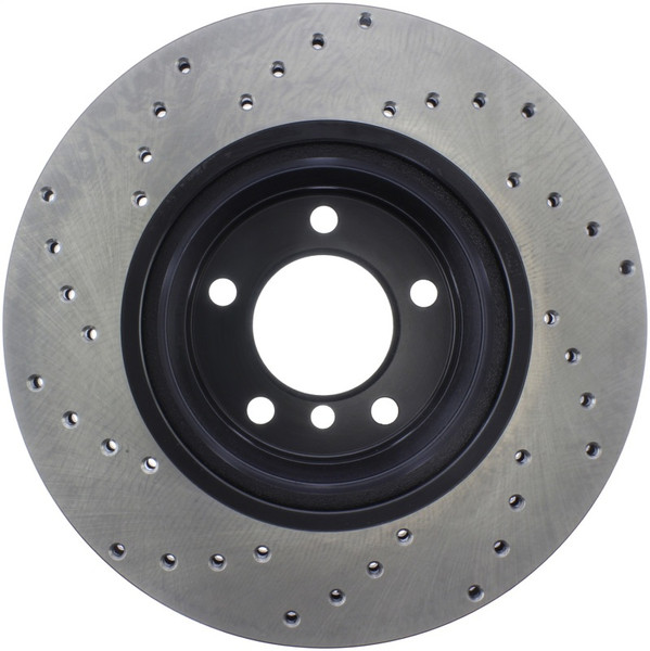 StopTech Drilled Sport Rotors are 1-piece direct replacement brake discs for factory brake systems and stock calipers that look great behind your wheels – and offer significantly improved braking performance. The unique cross-drilling aids with heat and brake dust dispersal, prevents glazing of the pads, adds bite and improves wet and dry braking performance. Built to last, the black e-coating provides protection from corrosion and the high carbon metallurgy (in most applications) offers quieter operation, better crack resistance and increased performance.