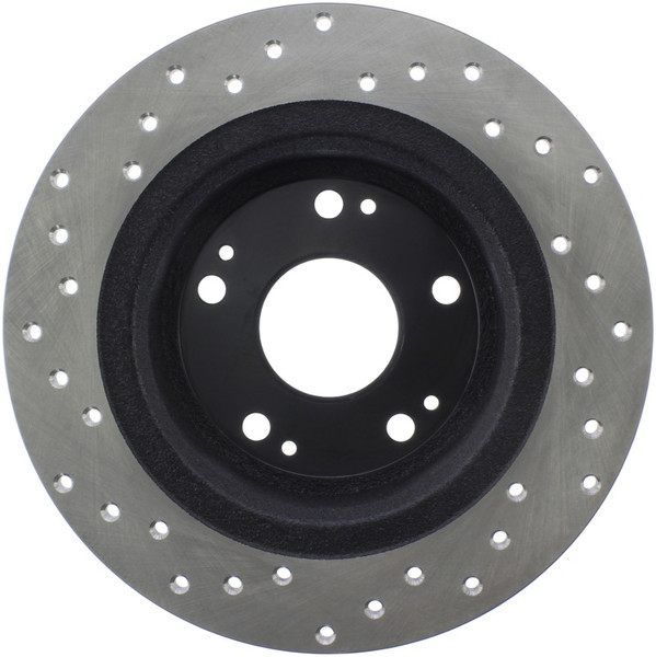 StopTech Drilled Sport Rotors are 1-piece direct replacement brake discs for factory brake systems and stock calipers that look great behind your wheels – and offer significantly improved braking performance. The unique cross-drilling aids with heat and brake dust dispersal; prevents glazing of the pads; adds bite and improves wet and dry braking performance. Built to last; the black e-coating provides protection from corrosion and the high carbon metallurgy (in most applications) offers quieter operation; better crack resistance and increased performance.