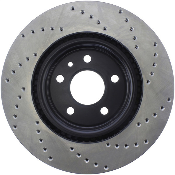 StopTech Drilled Sport Rotors are 1-piece direct replacement brake discs for factory brake systems and stock calipers that look great behind your wheels – and offer significantly improved braking performance. The unique cross-drilling aids with heat and brake dust dispersal, prevents glazing of the pads, adds bite and improves wet and dry braking performance. Built to last, the black e-coating provides protection from corrosion and the high carbon metallurgy (in most applications) offers quieter operation, better crack resistance and increased performance.