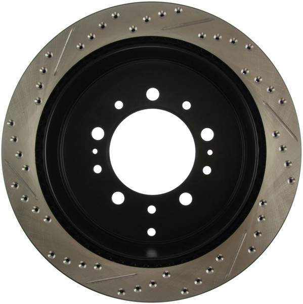 StopTech Drilled and Slotted Sport Rotors are 1-piece direct replacement brake discs for factory brake systems and stock calipers that look great behind your wheels – and offer significantly improved braking performance. The unique cross-drilling and slotting aids with heat and brake dust dispersal; prevents glazing of the pads; adds bite and improves wet and dry braking performance. Built to last; the black e-coating provides protection from corrosion and the high carbon metallurgy (in most applications) offers quieter operation; better crack resistance and increased performance.