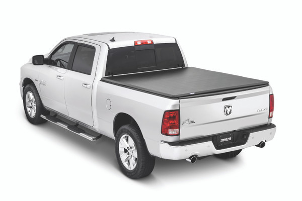 Tonno Pro's TonnoFold soft tri-folding truck bed cover is one of the easiest to use tonneau covers with exceptional durability and great looks. Its tear-resistant, double-sided vinyl top is long lasting and can handle heavy winds, light rain and snow. Under the notably strong vinyl is a powder-coated aluminum frame for an added level of protection from everyday wear and tear. This tri-folding cover keeps a tight fit to the truck bed, does not sag and has limited flutter when vehicle hits high speed. TonnoFold is delivered completely assembled making install a breeze Â-- no drilling necessary. Simply square up the cover to your truck bed and use its easy-to-use clamping system to lock it securely in place. Hauling large cargo? Completely remove the cover in minutes to meet your unique carrying needs.