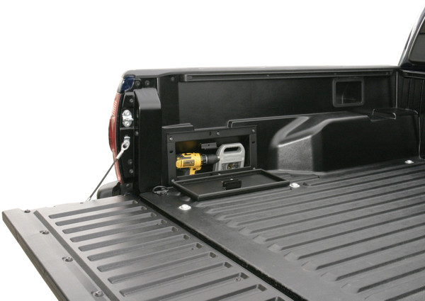 This 16 gauge steel security box replaces the plastic factory storage unit located in the Toyota Tacoma truck bed. The innovative design of the Tuffy replacement lockbox has 710 cubic inches of lockable storage which is over double what the original factory model has. It features Tuffy’s exclusive Pry-Guard Locking System with a 10 tumbler double bitted security lock with built in weather seals. The design incorporates a continuous steel hinge, weather seal, welded construction, and a durable powder coated finish. This heavy duty lockbox bolts to the factory holes in the Toyota Tacoma truck bed without any drilling. Mounts standard on the left side of the Toyota Tacoma bed but can also be mounted on the right side on models that did not come equipped with the optional power outlet.