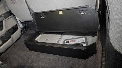 This high security steel security lockbox mounts under the rear seat in a 2015-2024 Ford F-150 and 2017-2024 Ford F-250 and F350 Super Duty SuperCrew Crew Cab. The full width formfitting design of the Tuffy lockbox has over 4500 cubic inches of lockable storage. Its secured contents are easily accessed by flipping either or both rear seat(s) up and opening the corresponding lid(s). The unique design allows the full width to be used to stow firearms or other long items. Featuring Tuffy's Pry-Guard Locking System with a 10 tumbler double bitted security lock with built in weather seals. Chamfered corners are incorporated into the design making it easier to operate the seat releases as well as aiding passenger ingress and egress.