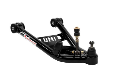 UMI’s Corner Max line of race a-arms are designed from the ground up to be the best performing stock mount a-arm upgrade on the market. The P/N 4062 arms are strong yet lightweight and feature a removable lower mounting system to permit spring changes at the track without separating the ball joints. The ball joint cup is moved forward the proper amount to add up to 4 degrees caster potential and is loaded with high quality Howe standard height ball joints. The double shear coilover mount accepts race industry standard ½†rod end shocks and comes with spacers for all popular models. Also included is a double shear sway bar mount and corresponding end link. The end link fits UMI 4035 and 4067 as well as many other factory fit sway bars. The P/N 4062 excels when paired with our DSGTECH 2†lowering tall spindle (tall spindle requires 4056 and standard ball joint height upper and lower).