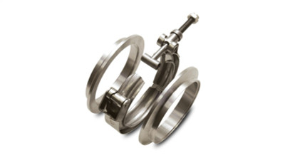 Vibrant Performance v-band flanges are constructed entirely from a 300 series stainless steel clamp that features a unique quick release clamping mechanism, and a unique male/female CP1 grade titanium flange design to ensure proper alignment inside the clamp. Vibrant Performance v-band flanges are an excellent alternative to traditional flanged or slip tube connections and work well under operating conditions involving stress, vibration and significant temperature fluctuations. They are available in diameters that support O.D. tubing ranging from 2.5†to 4â€.