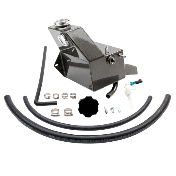 2013-2018 6.7L Cummins Fabricated Aluminum Coolant Tank Kit, mounts in OEM coolant tank location. All New Design. Dress up your engine bay by replacing the ugly clear plastic coolant reservoir with our custom powder coated fabricated aluminum coolant tank with sight glass. Includes black anodized CNC machined billet aluminum cap, mounting hardware, overflow hose and low coolant sensor. Will fit on stock trucks with no other modifications necessary. Uses OEM mounting points. Installs with basic hand tools. Compatible with stock / drop-in turbochargers and provides additional clearance for larger aftermarket and compound turbo setups.