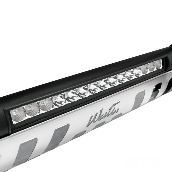 Westins Ultimate LED Bull Bar will take your truck to the next level with this cool new look! The integrated light bar is a 20 single row with 15 x 3 Watt Osram LEDs. The LED light bar is flush mounted in the center cross tube and weather sealed for moisture resistance. Built with 3 steel tubes, our Ultimate LED Bull Bar features molded transition bushings and a brushed stainless steel skid plate for a perfect look. The product is available in chrome plated stainless steel backed by a lifetime warranty, and in textured black powder coat backed by a 3-year warranty. Make a bold statement with Westins new Ultimate LED Bull Bar and give your truck the durability, look and style it deserves.