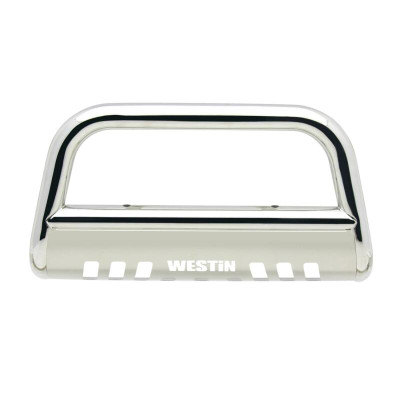 Westin(TM) E-Series Bull Bars are a front-end light bar designed for trucks and larger model SUVs. It is made of 3 diameter polished stainless steel tube. It mounts utilizing existing vehicle mounting points and installation does not require any drilling to the vehicle frame. Comes complete with mounting kit the Westin(TM) E-Series Bull Bar provides a mounting point for 2 auxiliary lights up to 6 in diameter. It features a die-cut Westin(TM) block logo design on the stainless steel skid plate unique to the Westin(TM) E-Series Bull Bar.