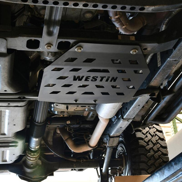 Westin's Transfer Case Skid Plate protects the transfer case from damage during off-road driving or rock crawling. The 7 gauge steel plate features a laser cut WESTIN logo and other openings that help minimize weight, and has formed edges for maximum strength. Direct bolt on installation for Jeep Gladiator, 2 door or 4 door Wrangler JK, and JL. Optional gas tank, oil pan, evap canister, and muffler skid plates available (sold separately).